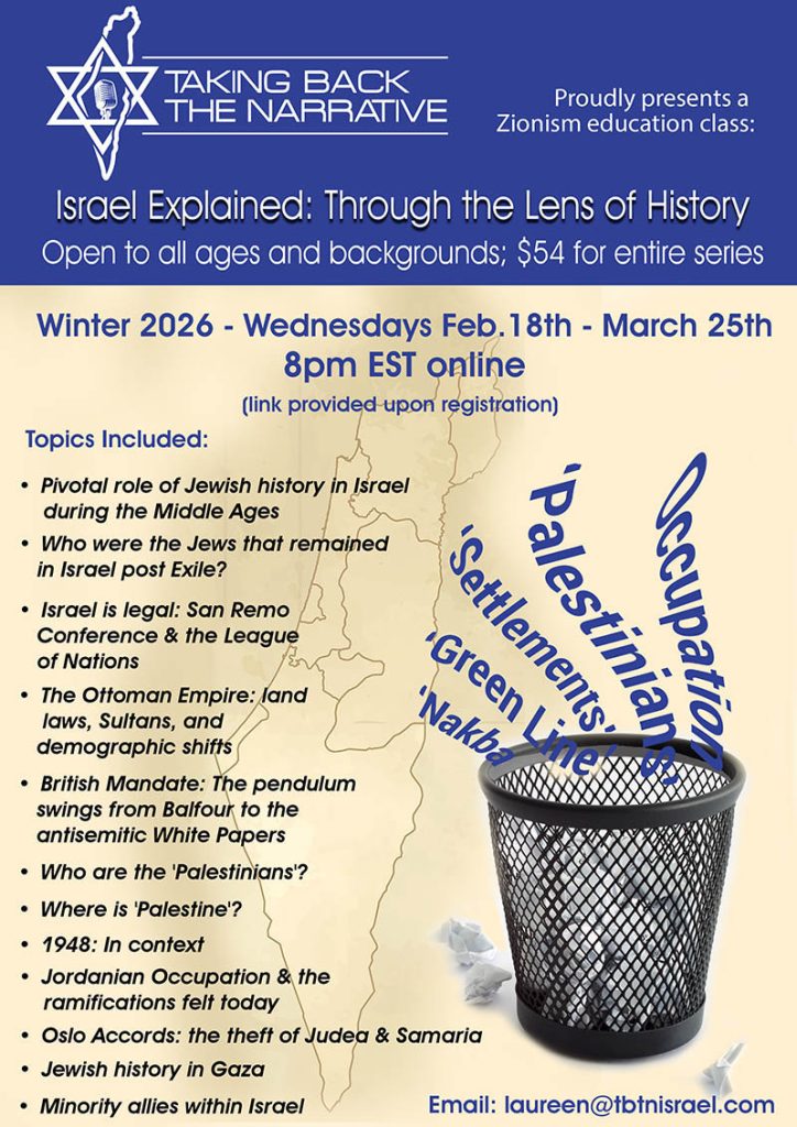 The course series, presented by Taking Back the Narrative (www.tbtnisrael.com), will take a deep dive into the history and connection of the land of Israel and the Jewish people. Origins of both the Jewish and Arab people will be explored. Learn to combat antisemitism and Anti-Zionism, effectively, through historical education.